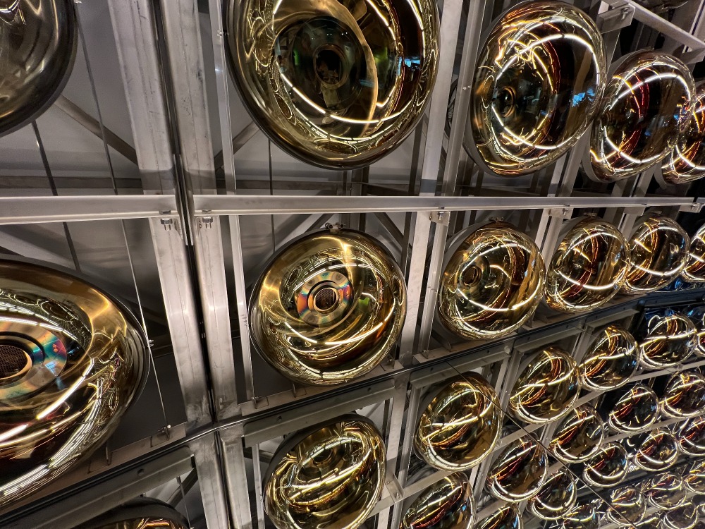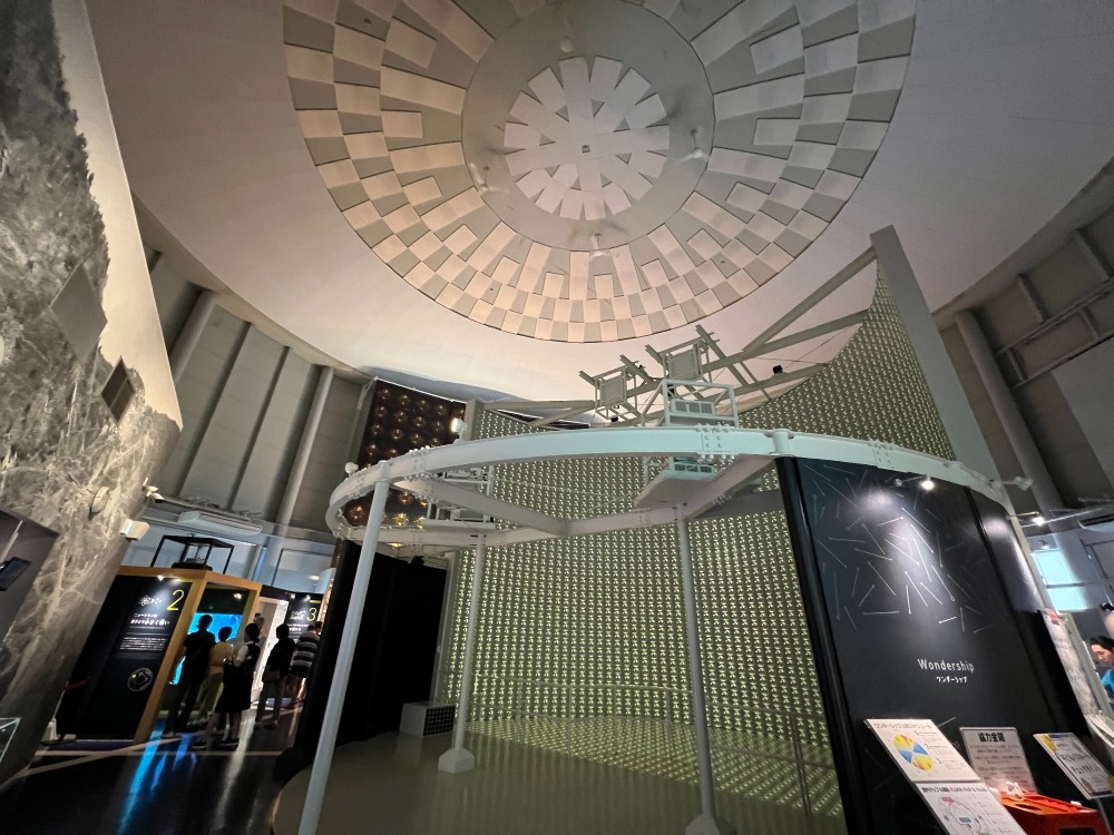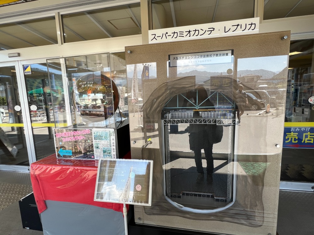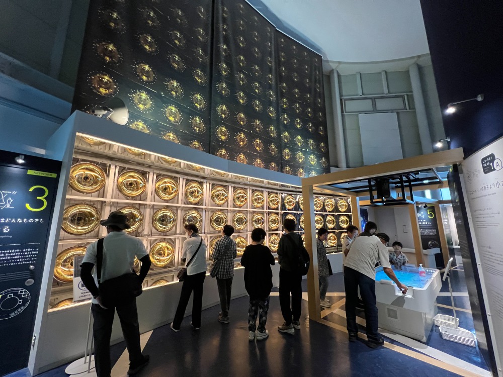 カミオカンデでは、スーパーカミオカンデができるまでを当時の映像で体感しながら学びました。電気をもたない中性の小さい素粒子のニュートリノ。まだ謎の多い不思議な素粒子で研究が進められています。飛騨氏神岡町にはノーベル物理学賞をもたらしたスーパーカミオカンデをはじめ宇宙と素粒子の謎を研究するための研究拠点が集まっているそうです。入館してすぐの大型スクリーンでは普段感じることができない素粒子の不思議な性質を迫力のある映像で体感したほか、研究拠点の内部の映像はニュートリノを観測している巨大な装置を見ながらまるで内部にいるかのような体感ができました。また、内水槽の壁面の一部にある金色に輝く光電子増倍管は実際の検出器と同じ材料・取付方で忠実に再現されていて一つ一つ手作りで作られているとのことでした。ニュートリノを突き抜けていく様子をボールを使ってゲーム感覚で学べた他、子どもから年配の方までちょっと難しい宇宙物理学をわかりやすく体験し学ぶことができました。