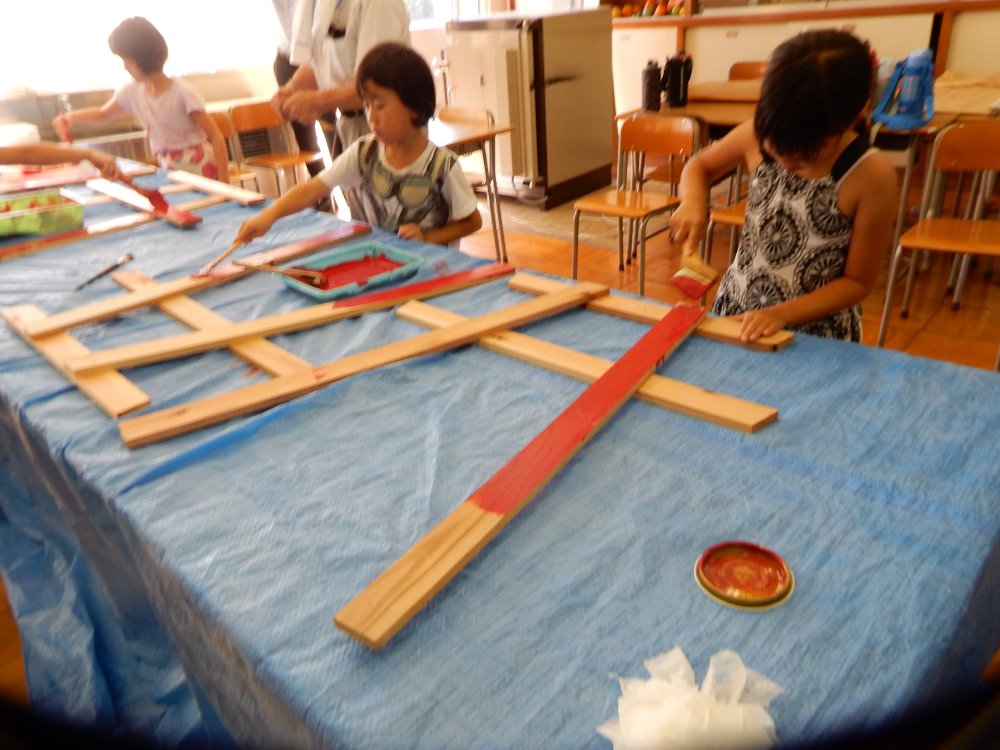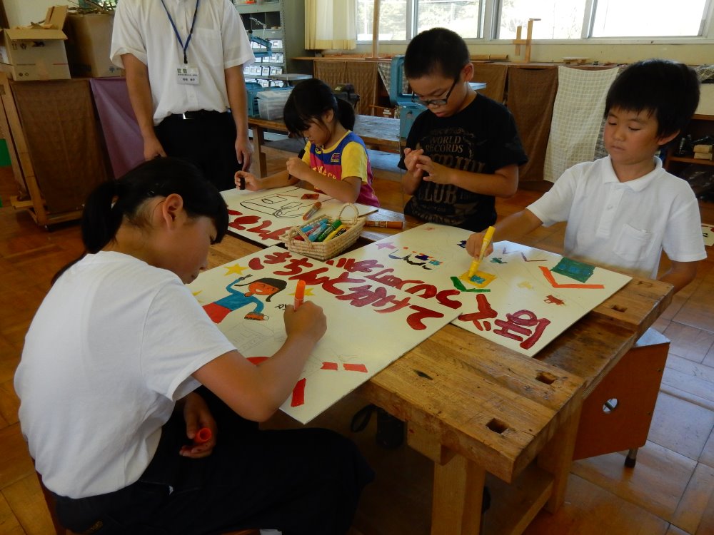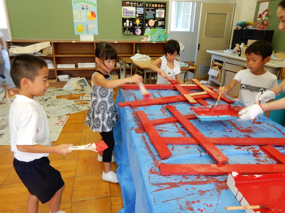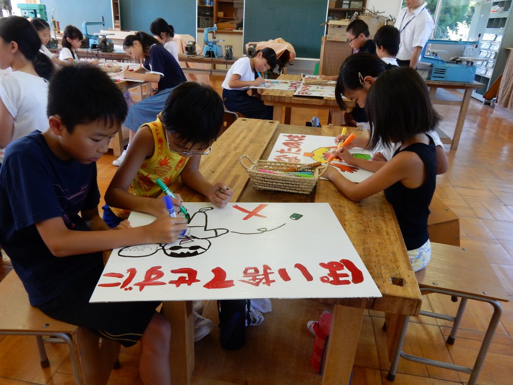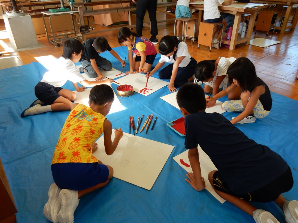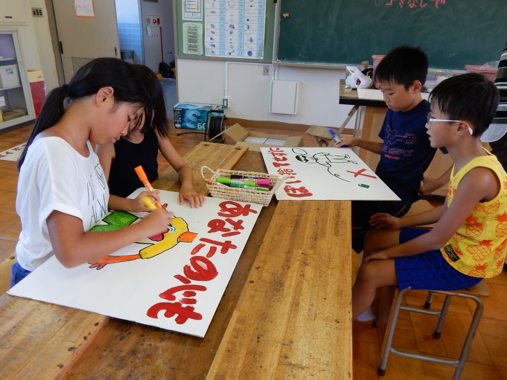 毎年、浅野川水害の日が絆の日となり、ボランティア活動の一環としてポイ捨て禁止の看板を作成しています。今年は猛暑の為、絆の日が延期となり小学校の登校日に行われました。高学年が下書きをしてくれて低学年の子供たちはお兄さん、お姉さんの教えてもらいながら次々とカラフルな看板を仕上げていきます。医王山小学校は縦割りで活動することが多いので、この活動でも高学年がテキパキと作業を進めてくれあっという間に24枚の看板が仕上がりました。一年生のみんなにはポイ捨てが抑制される効果がある鳥居のペンキ塗りをしてもらいました。一年生も暑い中、キレイに鳥居のペンキを塗ってくれました。来年のクリーンキャンペーンで新しい看板に変えます。ポイ捨てが少なくなりますように!