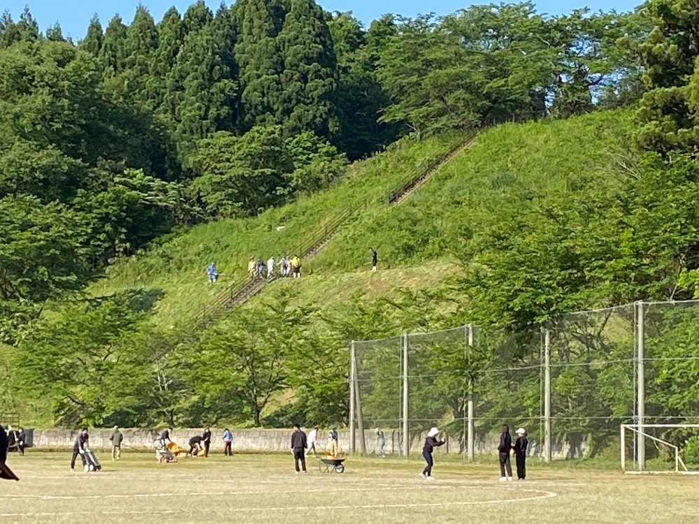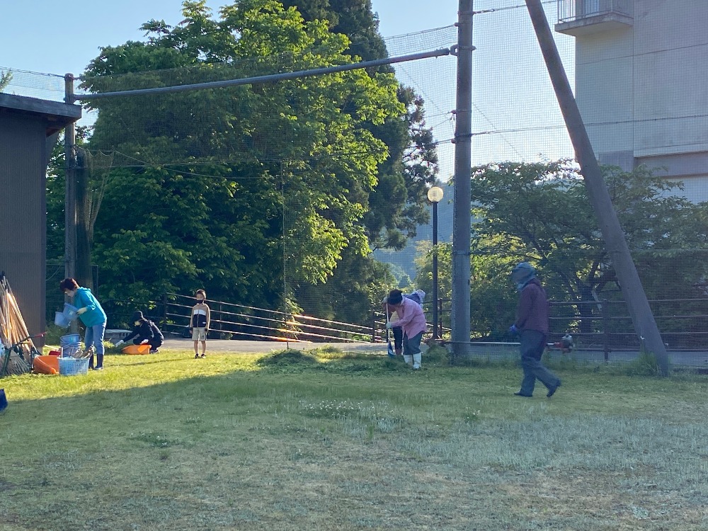 運動広場の草うむしりをしました。朝早くから地元の方が草刈機で除草していただき、中学校の生徒・保護者、先生がたには草集めをしていただき広い運動場がとても綺麗になりました。来週開催の運動会の前にすっきりしました。