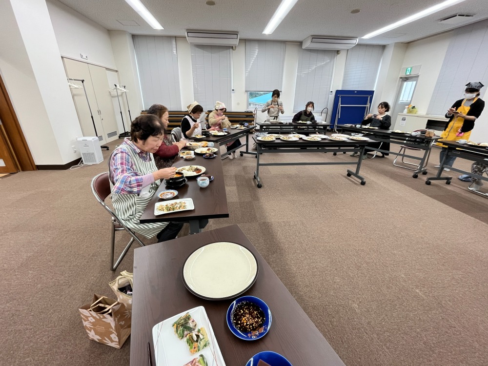 スンドウブは豆腐やエノキなど家にある食材で簡単にでき、韓国の唐辛子でピり辛ですが体の芯からあったまる具沢山のスープです。チヂミは生地と具材を混ぜてフライパンで薄くやくのがコツでした。万能つけだれは和え物や蒸し鶏、冷奴にかけてもおいしいとのこと。沢山作ってレパートリーに増やすといいですね。お持ち帰りに皆さん大人気のキンパ堂のキンパのお持ち帰りつきでした。