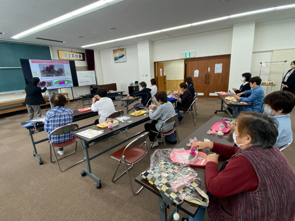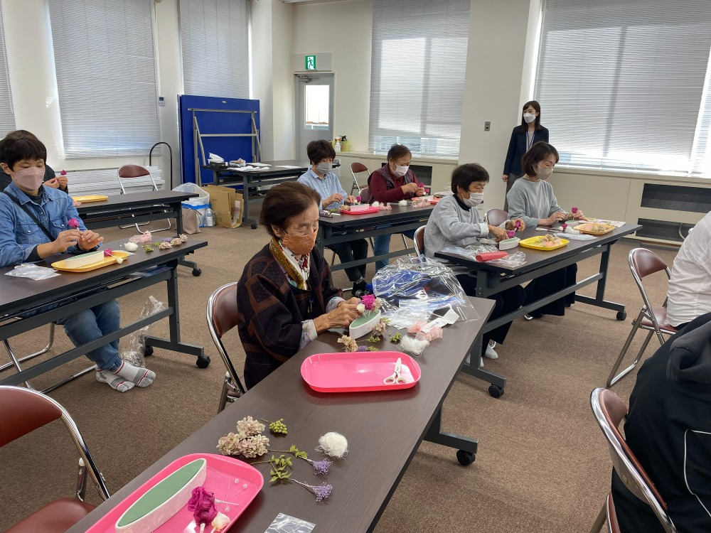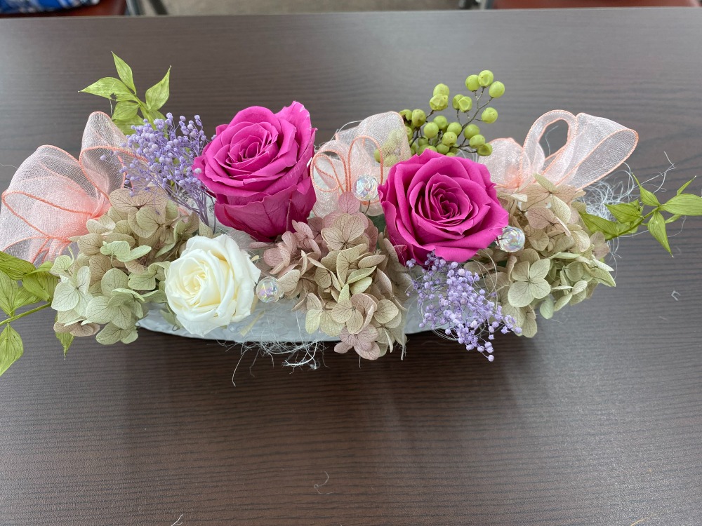 エネルギー講座のあとはお楽しみのクラフト体験です。今回はピンク色のプリザーブドフラワーが入ったアレンジメント教室を行いました。皆さん素敵に出来上がりましたね♪