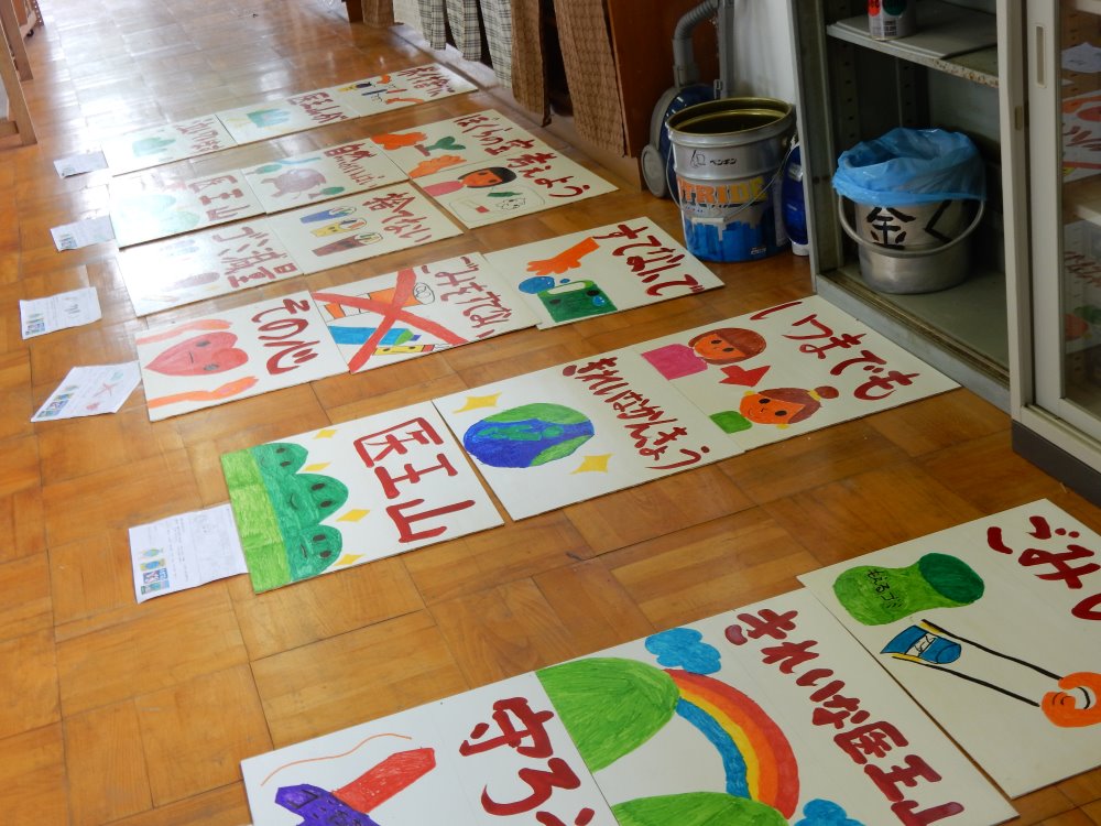今年度は1、2年生は来年の看板のもととなる標語やイラストを考えてくれました。