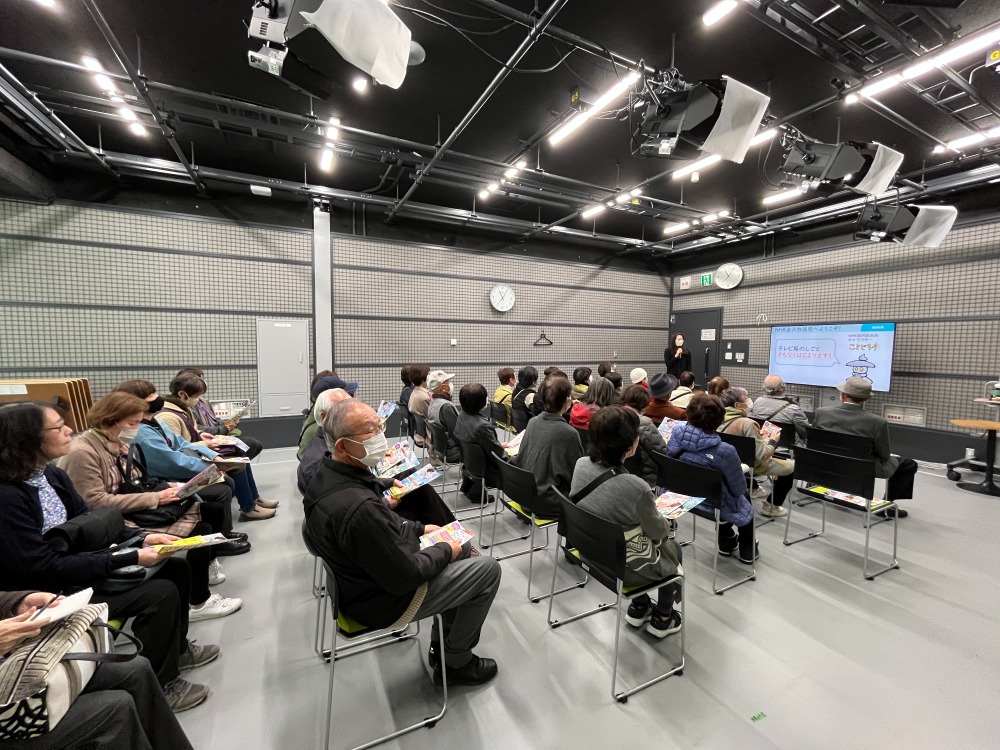 NHK金沢放送局はクイズ形式で全国のNHKの職員の数や金沢放送局は全国で何番目にできた法則局かをみんなで考えながらお話しを聞きました。なんと金沢放送局は日本で8番目にできた放送局で全国に57カ所ある放送局の中でも日本海側で一番早くできた放送局だそうです。金沢放送局の実際に使われているひゃくまんスタジオではニュースができるまで、スタジオのひみつ、どうしてアナウンサーは原稿を見ずに前をむいて喋れるかなど、実際のスタジオの機器を見学しアナウンサー体験もしながら楽しく学べました。参加者の方からは、夕方のニュースのスタジオもここで撮影しているのか?やお天気カメラがどうやって掃除されているのか等いろいろな疑問について詳しく解説してくれました。毎日見ているテレビ画面の奥。見えないところで沢山の方が働き、いかにわかりやすくニュースや情報を伝えるか綿密な工夫がされていることがわかりました。