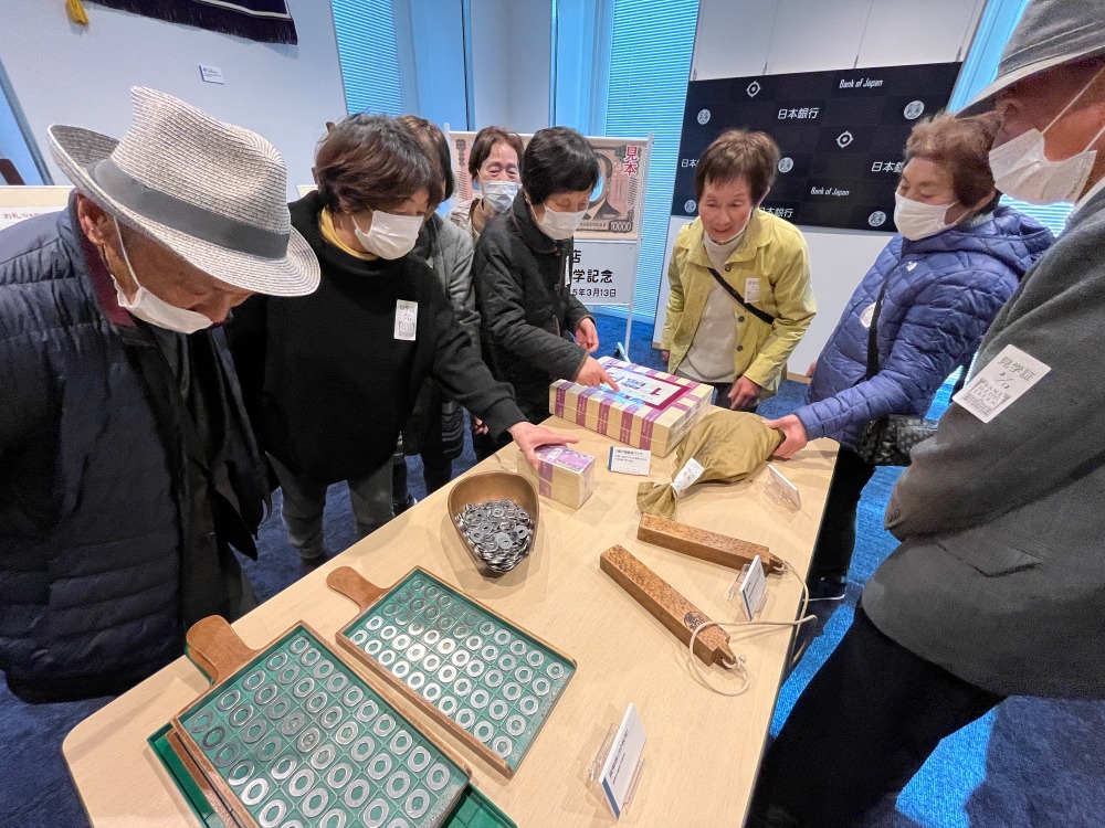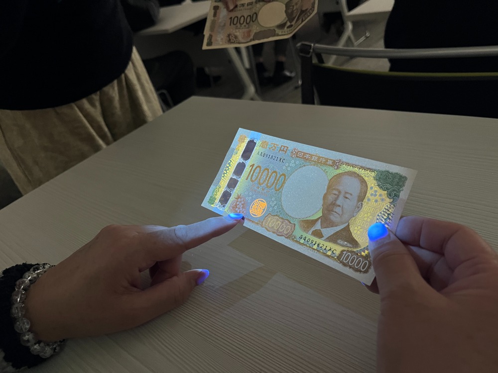お札の偽造防止では3Dホログラムやパールインキの採用で能登の震災で焼け焦げたお札でもお札であると識別できること、また識別マークは目の不自由な人にもお札の種類がわかるように工夫され、お札の表面には紫外線をあてると総裁の印が光る加工をされており、普段手にするお札にこんなにも沢山の偽造防止の技術やお札を識別するための工夫がされていることがわかりました。日本銀行の窓口では車の反則金や国庫金の納入をする窓口や損傷したお金を引き換えることができる窓口がありました。損傷したお金を引き換える窓口の職員の方たちはみなさんエプロンをされており、質問したところかなり汚れた硬貨やお札がくるとのことでした。