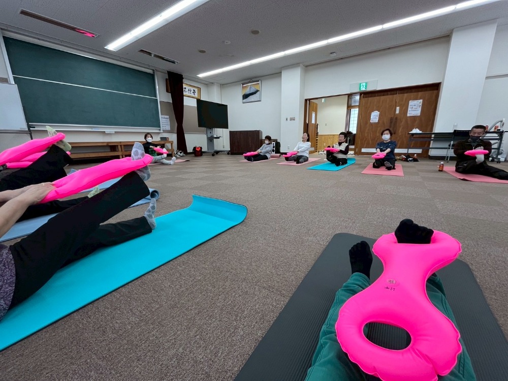 毎年お世話になっている3B体操の西村智子先生にお越しいただき、3B体操と自宅で簡単にできるストレッチ体操を行いました。今回はビニール製の八の字になった浮き輪みたいな道具で体をほぐしたり、伸ばしたり。そして投げてキャッチしたりと道具を使ってたくさん体を動かしました。