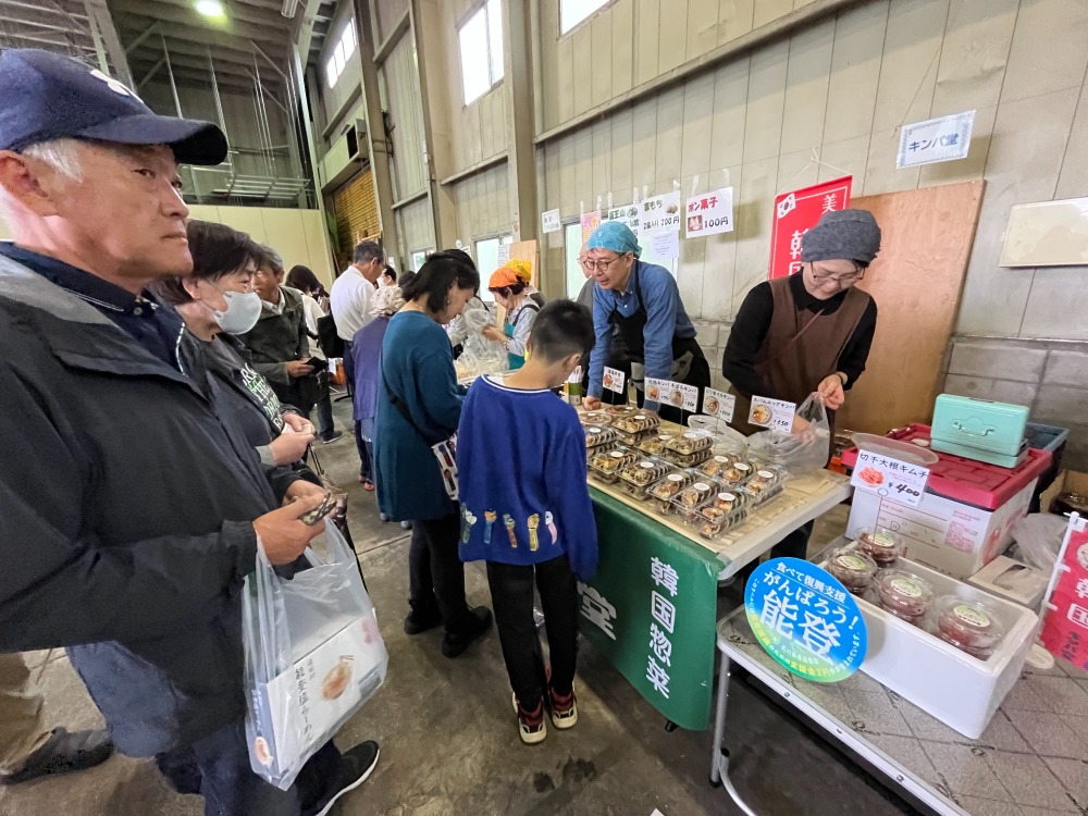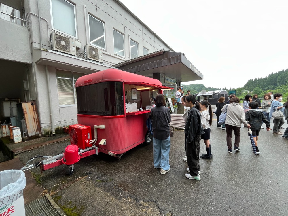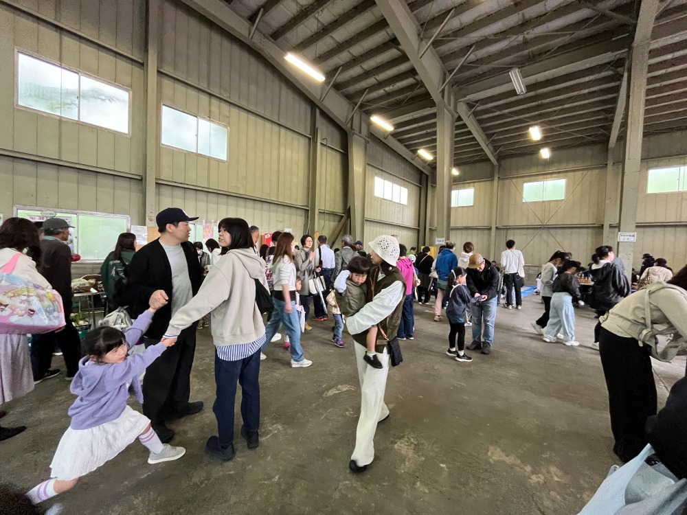 マルシェが始まる直前まで雨が降り心配だったお天気もうそのように晴れ、当日は千人を超える来場者でした。キッチンカーや模擬店にも長蛇の列ができ、老人会のつきたて餅や公民館のめった汁も大人気でした。