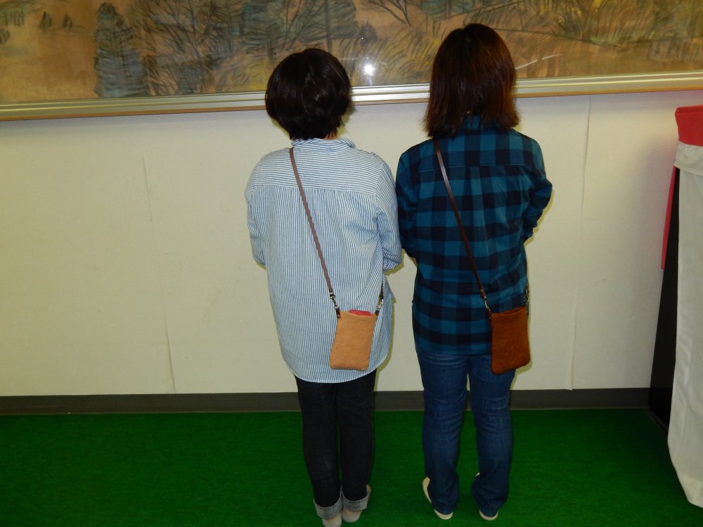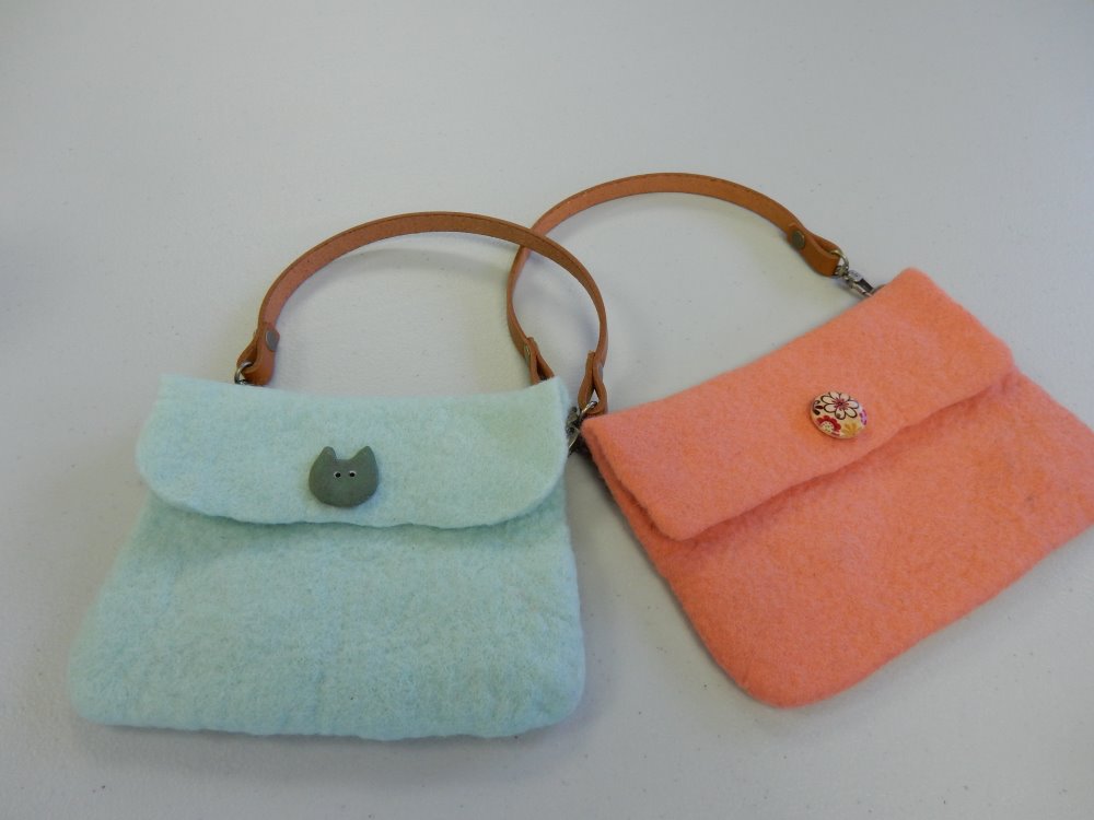 固まってきたらたたいたり!?投げたり!どんどん刺激をあたえて半分ほどの大きさまで縮めていきます。思い思いの大きさに仕上がったら革ひもやボタンをつけて完成です。長い革ひもをつけるとポシェットに。短い革ひもはミニバックになりました。皆さんかわいい羊毛のミニポーチが出来ましたね。手間ひまかけた分、愛着は倍増です♪