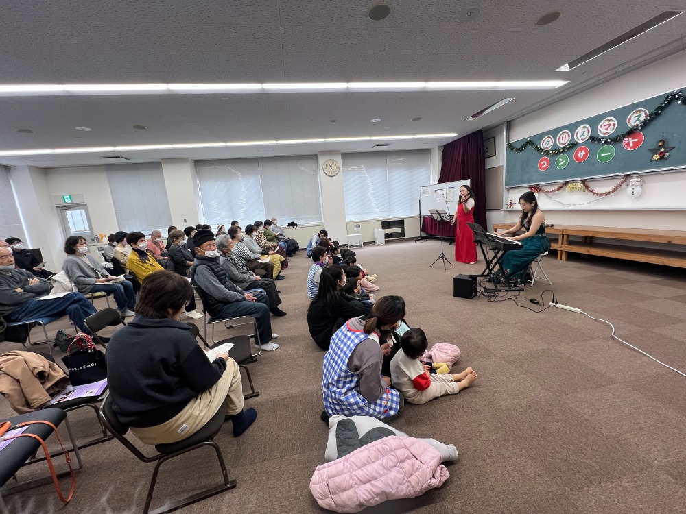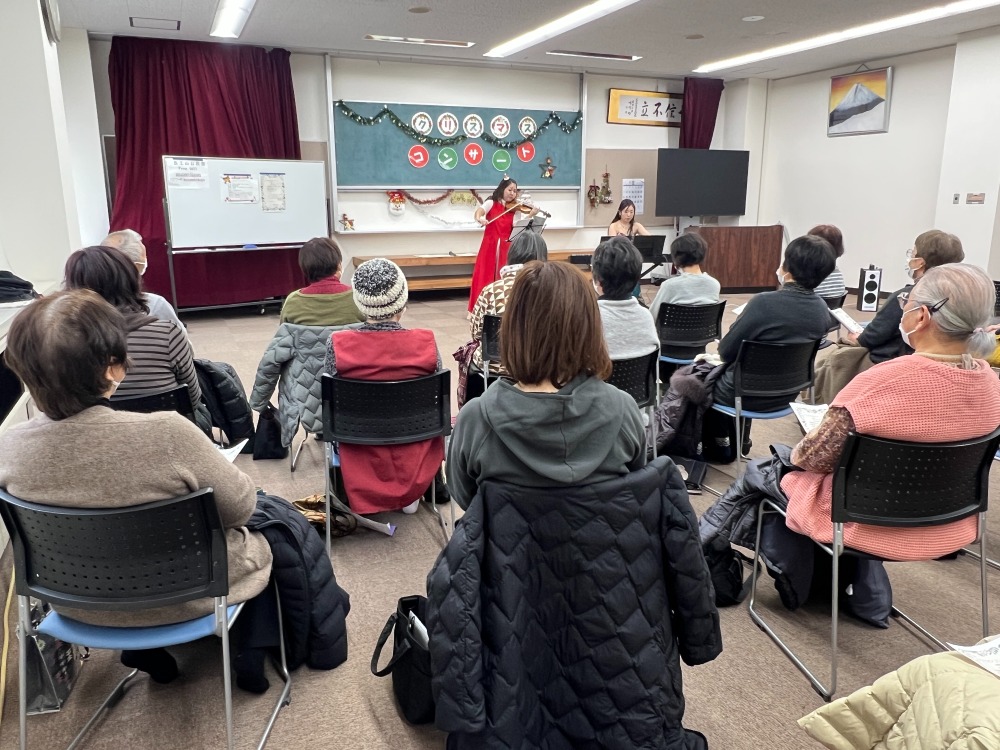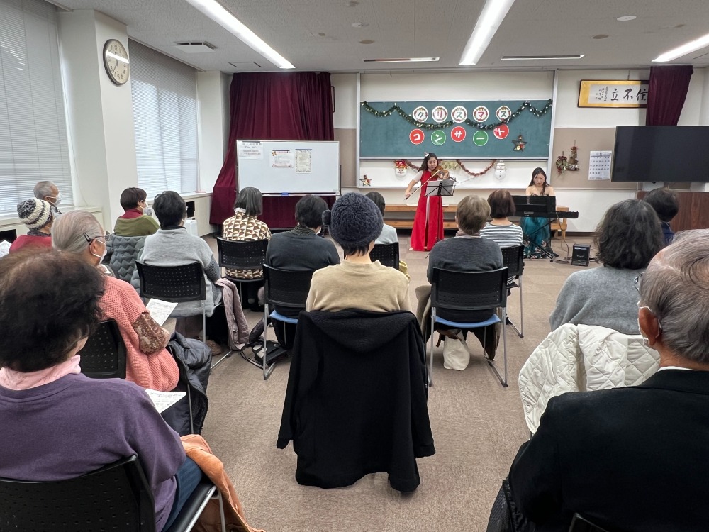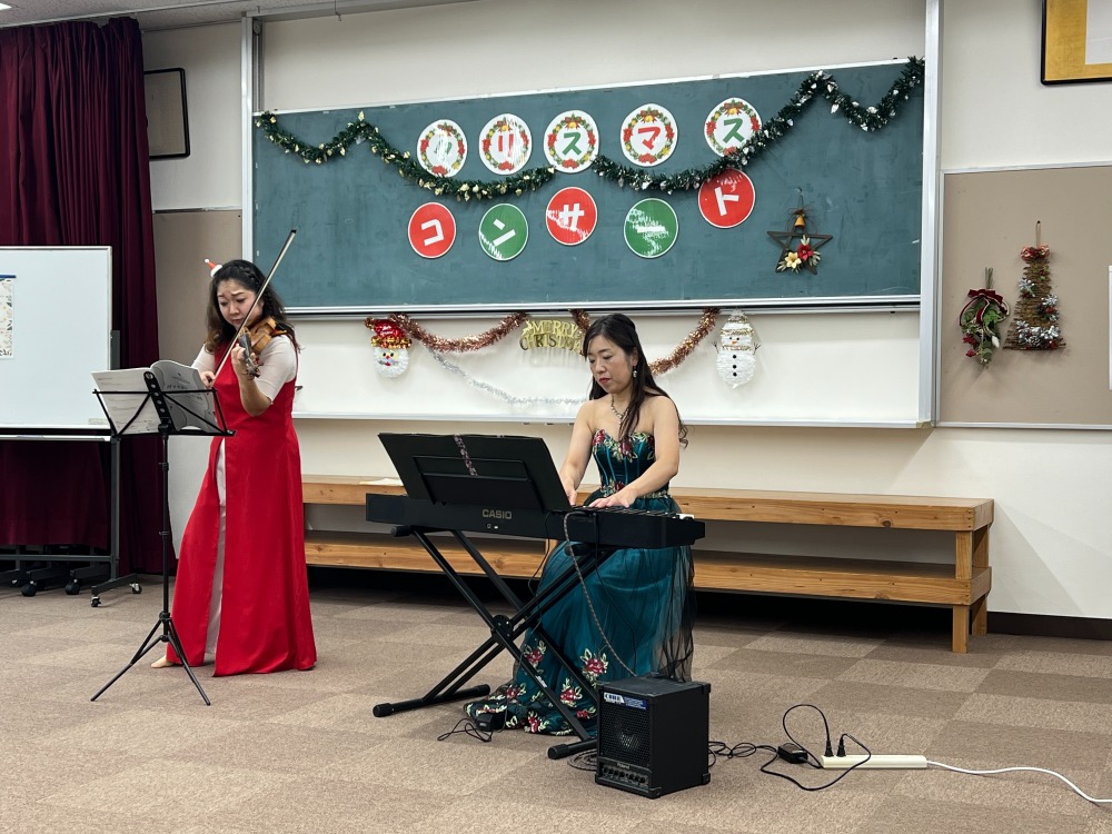 毎年みなさんお楽しみのクリスマスコンサート。今年もヴァイオリンは根来かなうさん。ピアノは北林多香子さんにお越しいただき、懐かしの曲からクラッシックの名曲、そして昨年参加者の方がリクエストした葉加瀬太郎さんの名曲まで幅広く演奏いていただきました。